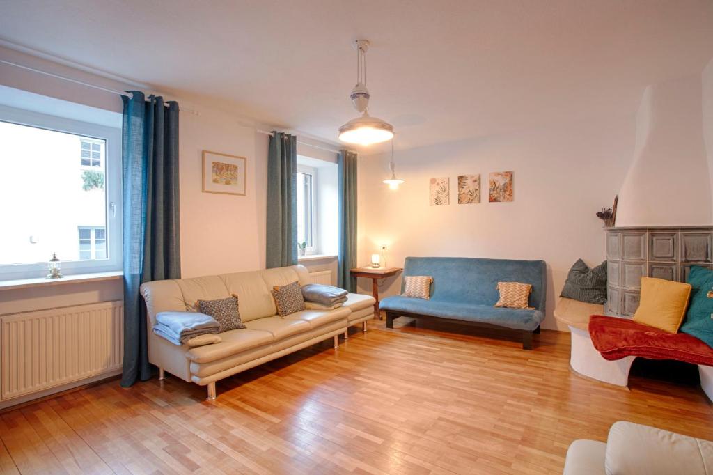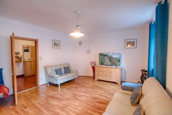 Das großzügige Wohnzimmer, ausgestattet mit SAT-TV sowie zwei bequemen Sofas und einer Schlafcouch, bietet den perfekten Ort für entspannte Abende nach einem erlebnisreichen Tag in den Bergen.