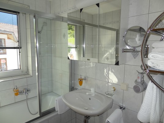 - Badezimmer mit Fön, Kosmetikspiegel, Seife, Badewanne mit Glasschiebetür