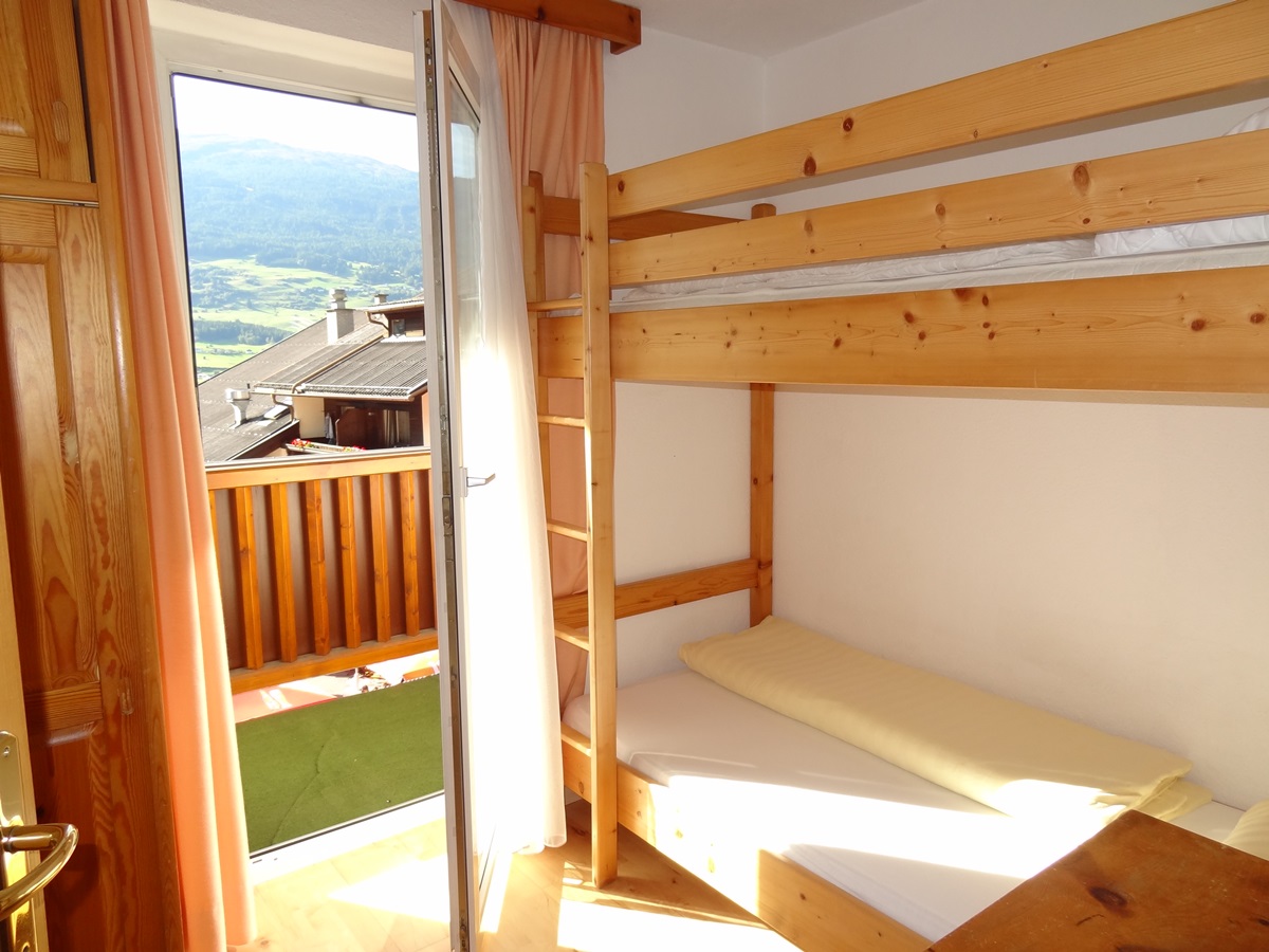 - Zwei Schlafzimmer: ein Doppelzimmer mit Terrasse und ein Zimmer mit einem Stockbett, einem Einzelbett und Balkon