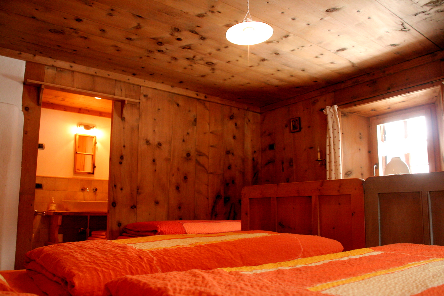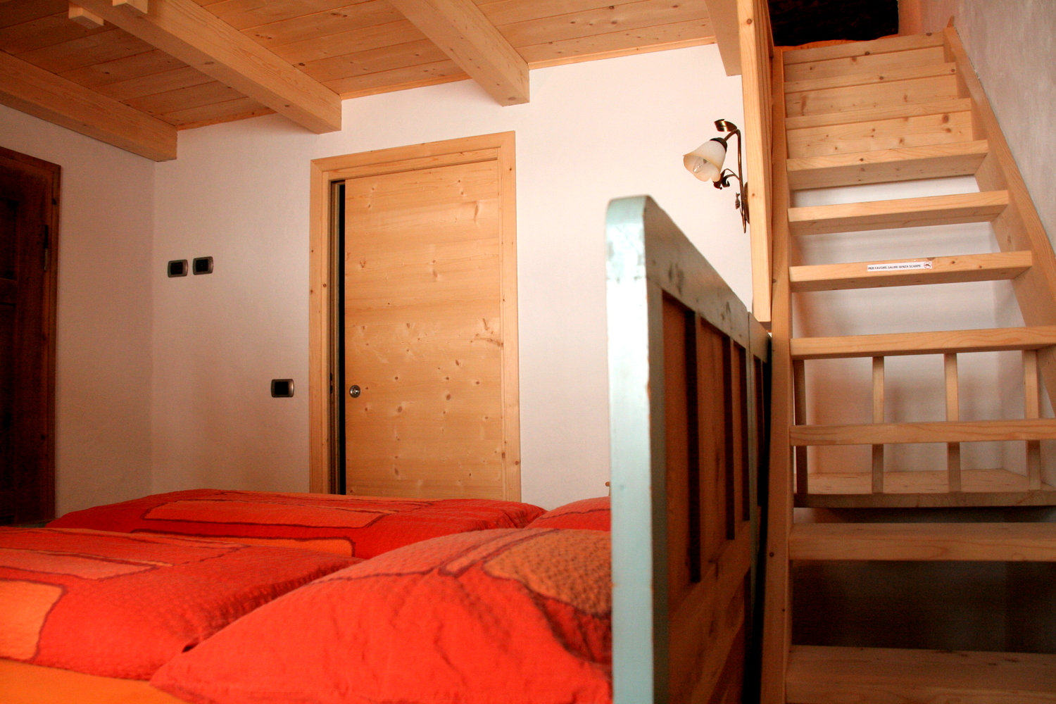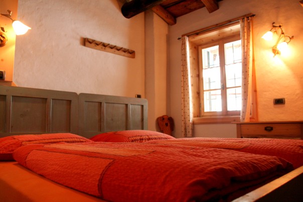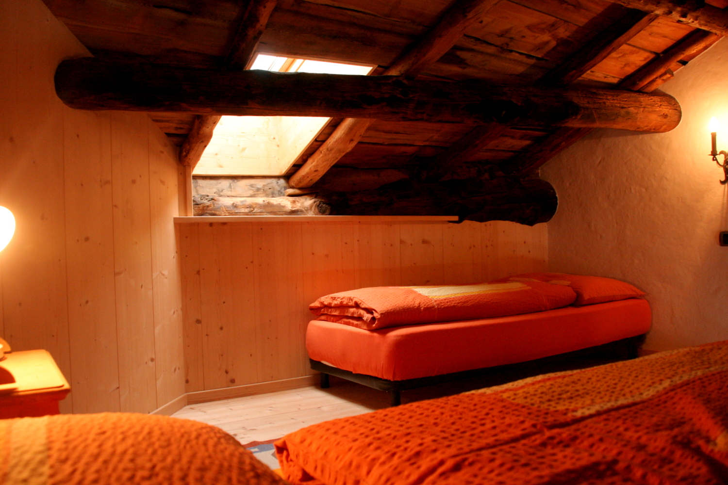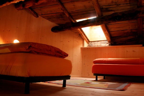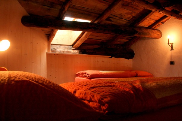 La Sctua dal Mika: In diesem charmanten Raum aus natürlicher Tanne erwartet Sie ein Doppelbett und zwei weitere Betten auf einem gemütlichen Zwischengeschoss. Die jahrhundertealten Balken und Bretter des Daches schaffen eine besondere Atmosphäre vergangener Zeiten und das große Badezimmer mit Dusche sorgt für zusätzlichen Komfort.