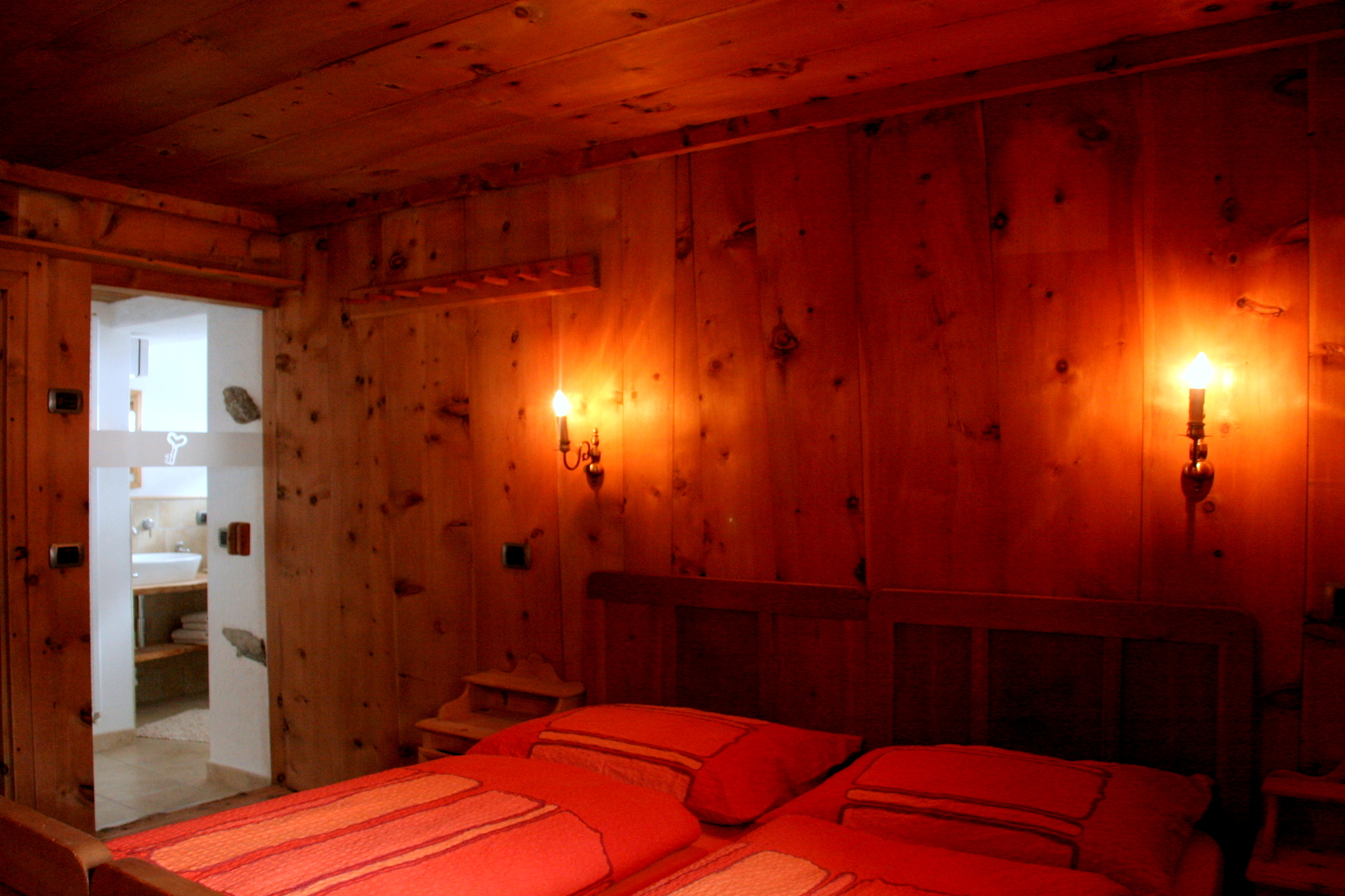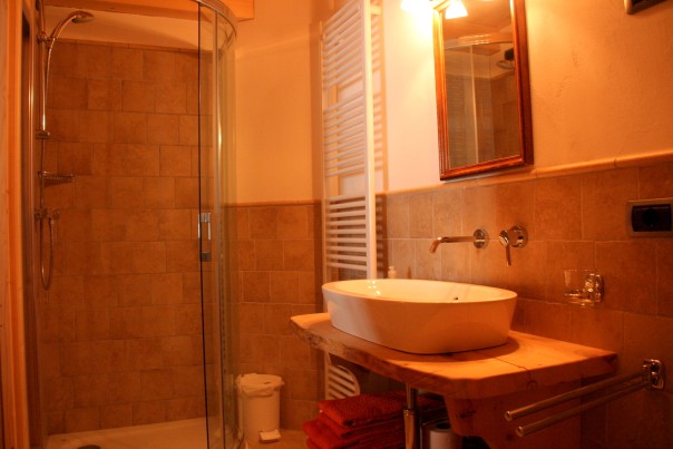 La Sctua da Maria: Ein intimes und einladendes Zimmer, vollständig aus Zirbenholz erbaut, empfängt die Gäste mit seinem warmen Duft und der wohligen Wärme. Das helle Badezimmer mit Dusche bietet ausreichend Komfort und lässt keine Wünsche offen.