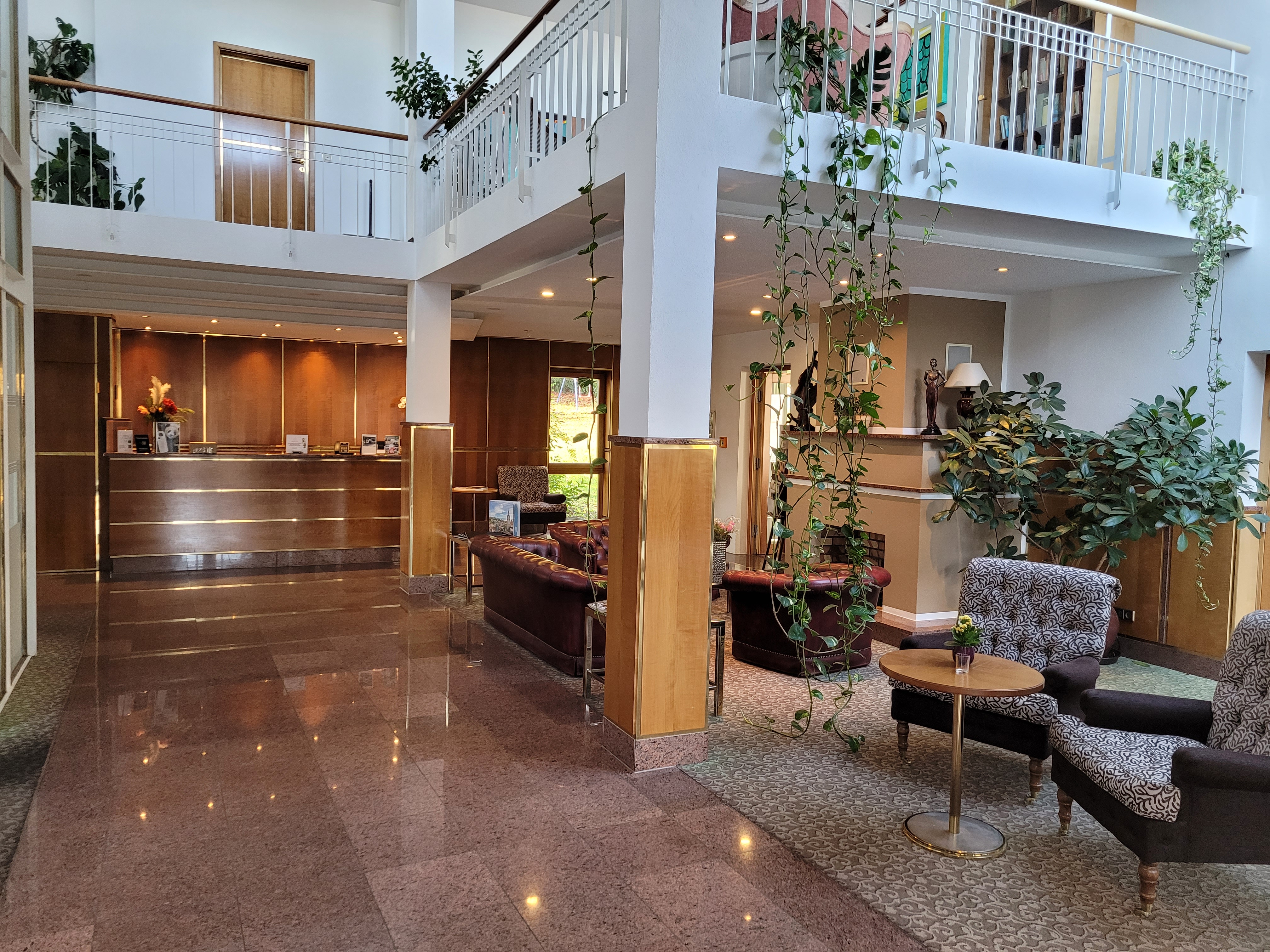 Empfangsbereich mit Galerie zum Lesen und sowie ein Flügel lädt die Hotelgäste zum Verweilen ein.