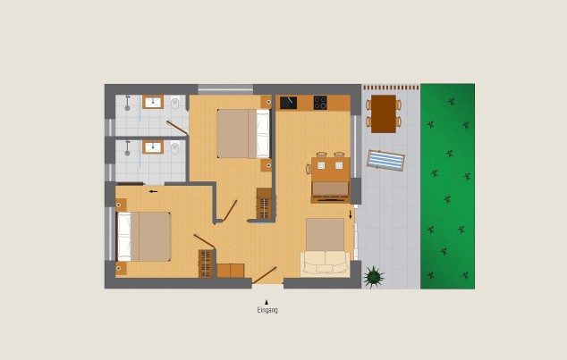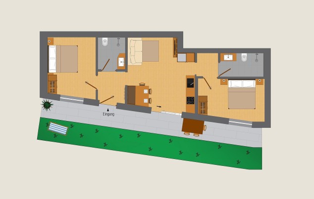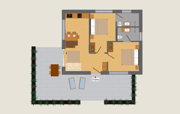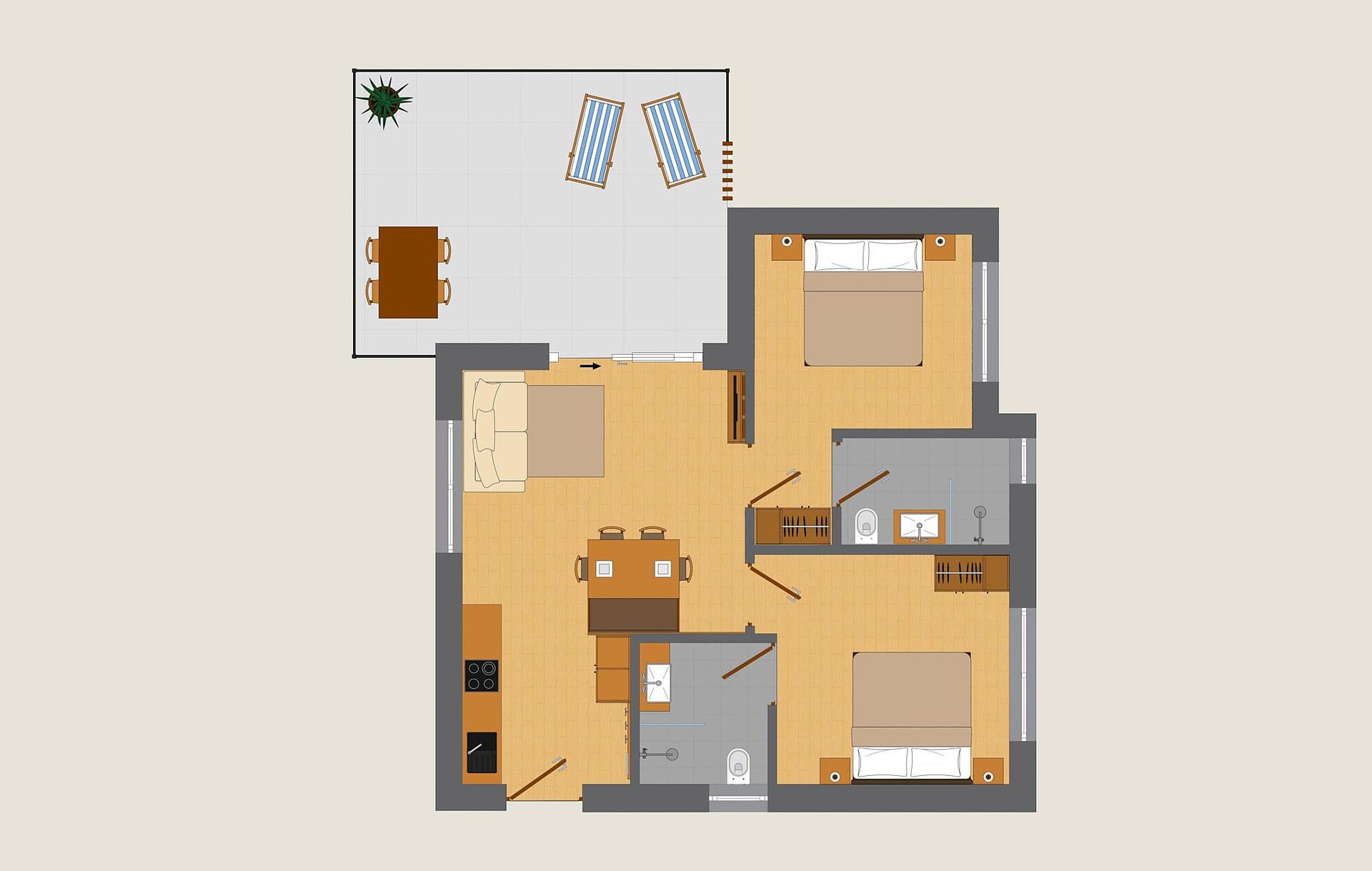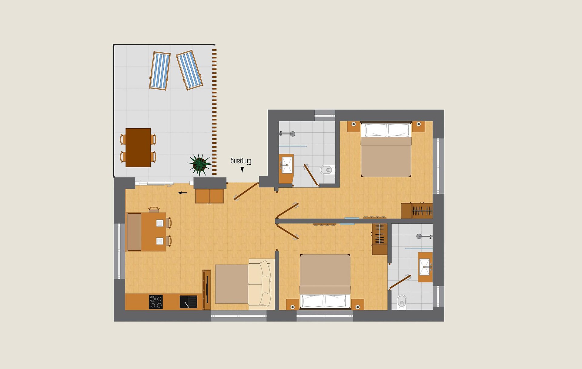 - Voll ausgestattete Ferienwohnungen mit Terrasse, zwei Schlafzimmern und zwei Bädern